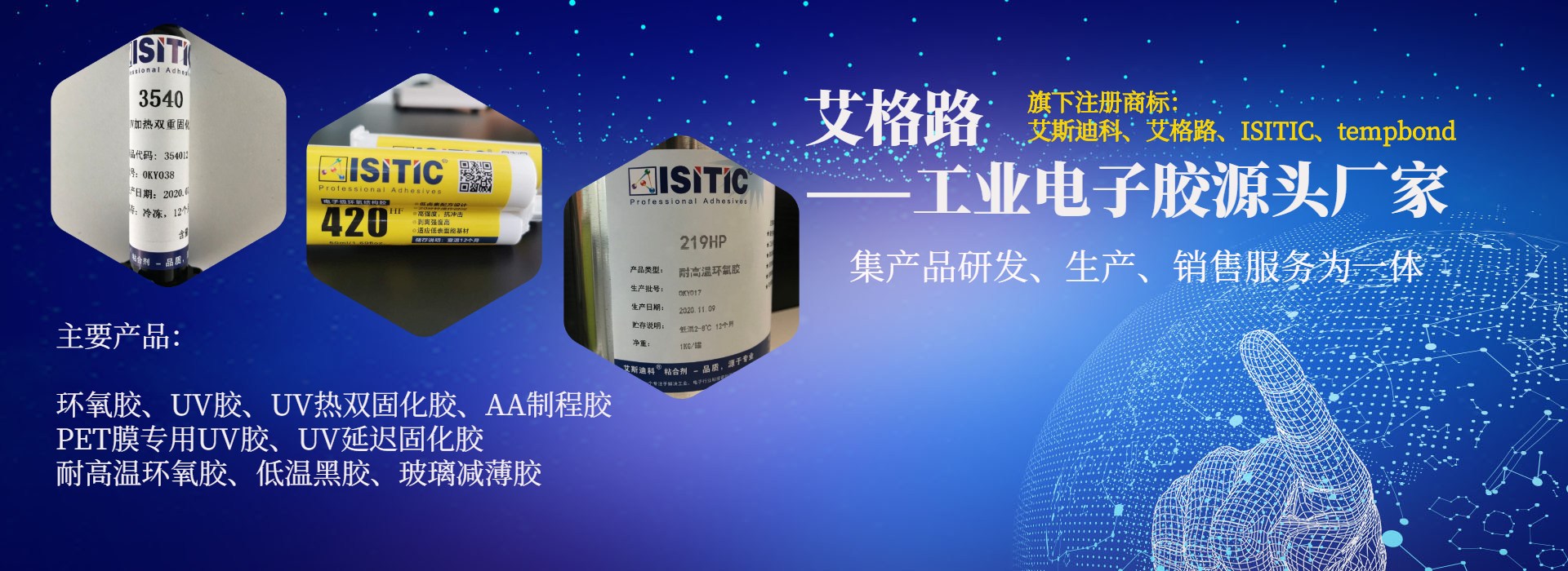 為客戶提供環(huán)氧膠、UV膠、臨時粘接膠、UV加熱雙固化膠、丙烯酸結(jié)構(gòu)膠等工業(yè)電子用膠解決方案